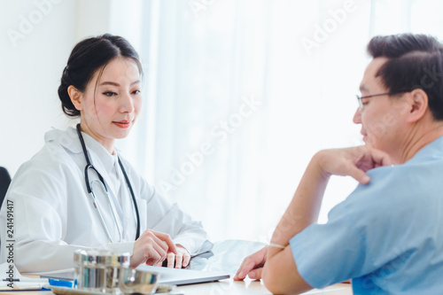 Fototapeta premium Old Patient men Talking with Medical Doctor women in clinic office