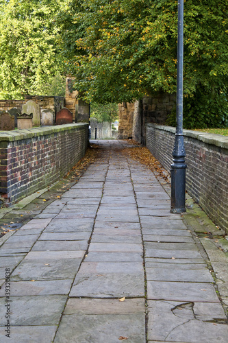 © arphoto, Obraz premium Old paved path next to Hexham Abbey grave yard
