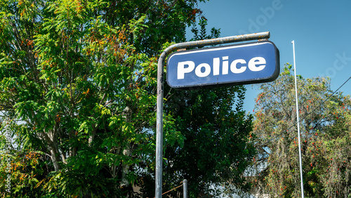 © Alexander, Fototapeta premium Old peeling blue Police sign