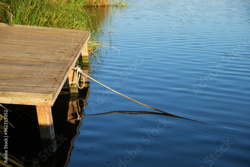 © barbarazm, Obraz premium old pier over water, rope tied to pier, water striders on water