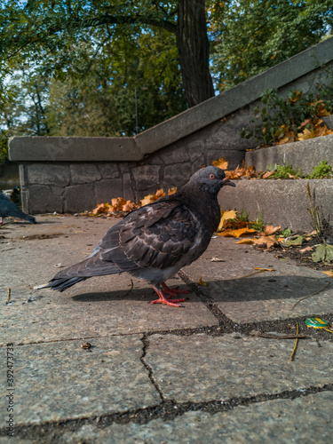 © Pawel-Wierzchowski, Fototapeta premium Old pigeon walking on stairs in park