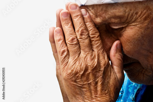 © Pavlo, Fototapeta premium Old praying grandmother. Mother knelt in prayer for the children. Close-up of a praying woman face. Tearful prayer to God