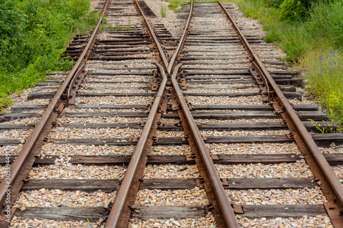 Fototapeta premium Old railroad track with switch and wooden ties