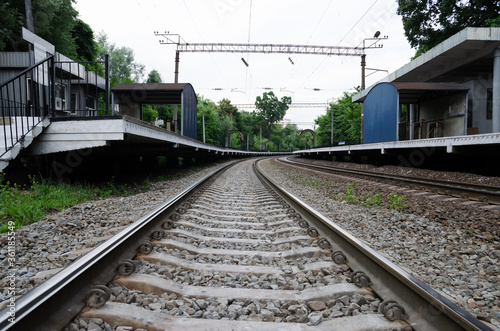 Naklejka premium Old rails in the landscape. Rails on the ground.