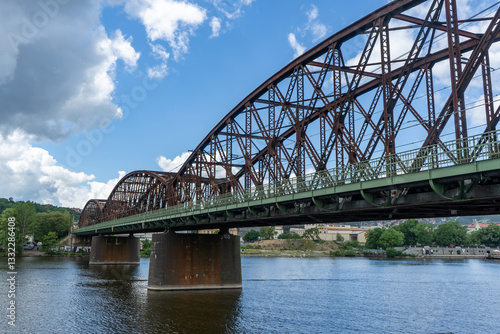 Obraz premium Old railway bridge and Vltava river in Prague