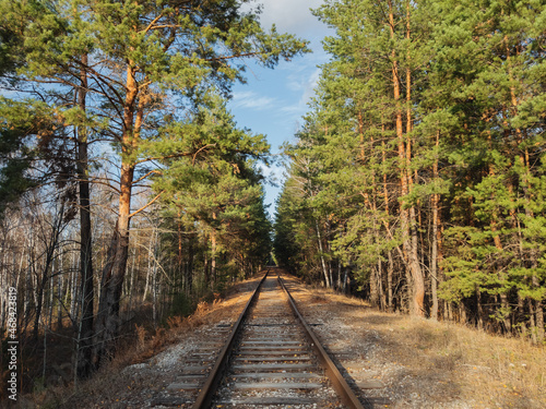 Fototapeta premium Old railway through a pine forest.