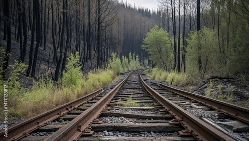 © ANRI, Fototapeta premium Old railway track curves through burnt forest with hints of new green growth