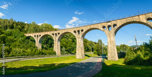 © Castigatio, Fototapeta premium Old railway viaduct in the mountains above the road, Lewin Klodzki.