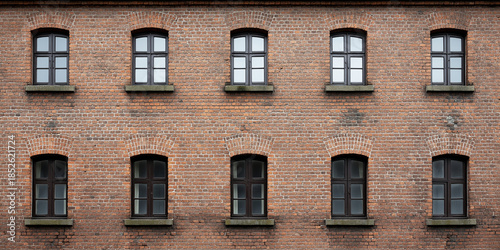 © Bonsales, Fototapeta premium Old red brick industrial building facade showing arched windows and textured wall background