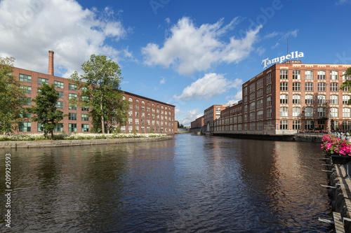 © tuomaslehtinen, Fototapeta premium Old red brick industrial buildings along the Tammerkoski rapids in downtown Tampere, Finland on a sunny day. Tampella was an industrial company operating there but now it's a district of the same name