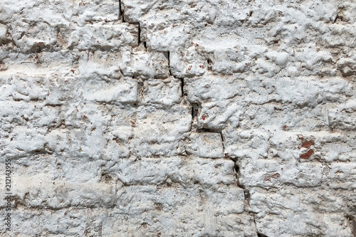 Naklejka premium Old red brick wall covered with a white plaster and a large cracked. Texture...