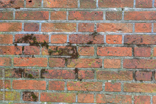 Naklejka premium Old red brick wall covered with green moss. Vintage stone background