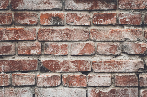 © tatyana, Obraz premium Old red brick wall in rustic style. Cement wall, grunge texture. Brown backdrop wallpaper. Rough vintage cracked brickwork. Textured backgrounds. Concrete, stone background, pattern.