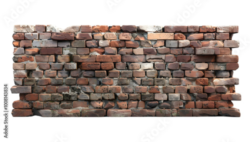 © Safdar, Obraz premium old red brick wall isolated on a PNG white background with no shadows or reflections. The bricks have different sizes and textures