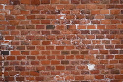 Obraz premium Old red brick wall texture with white efflorescence and weathered surface. Vintage masonry background for design, architecture, construction, and restoration projects. Rough textured red bricks with m