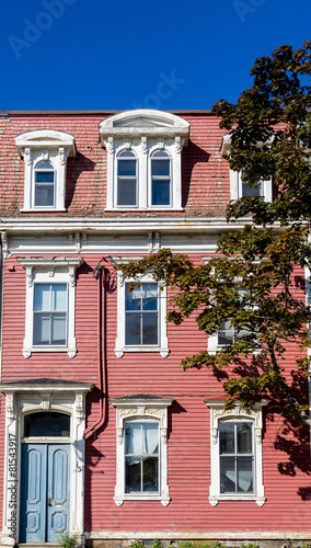 © dbvirago, Fototapeta premium Old Red Clapboard with Blue Door