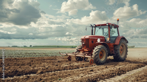 © standret, Fototapeta premium Old red tractor leveling the field under a cloudy sky