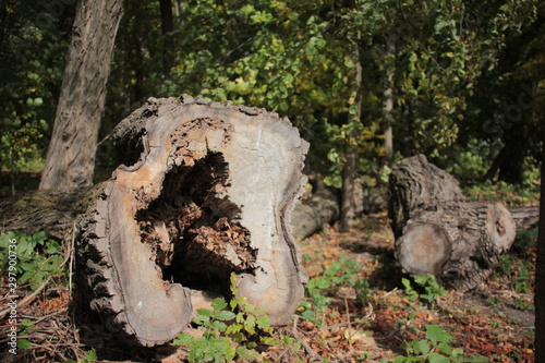 Obraz premium Old rotten tree cut down in the park