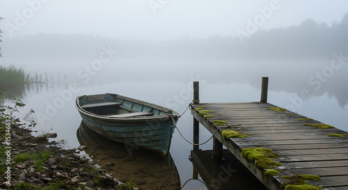 © ABDERRAHMANE , Fototapeta premium Old Rowboat on Misty Lake Dock