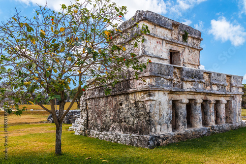 Naklejka premium Old ruined ancient Mayan house with tree in the front, Tulum, Yucatan...