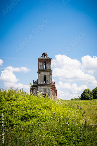 © Tatsiana, Naklejka premium Old ruined church in a green grass.