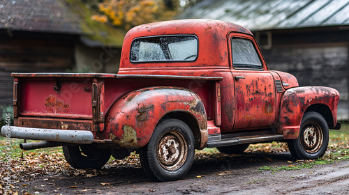 © Athiphat, Fototapeta premium Old rusted red pickup truck parked on dirt road, showcasing its vintage charm and weathered texture. truck back reveals peeling paint and nostalgic feel