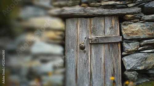 © MUHAMMAD ANIS, Fototapeta premium Old Rustic Wooden Door with Stone Wall Background in Nature Setting
