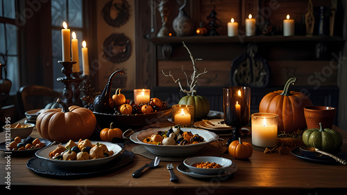 Fototapeta premium old, rustic wooden table surrounded by Halloween decorations