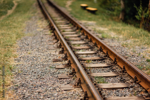 Fototapeta premium Old, rusty, abandoned railway rails, stretching into the distance. Grass...