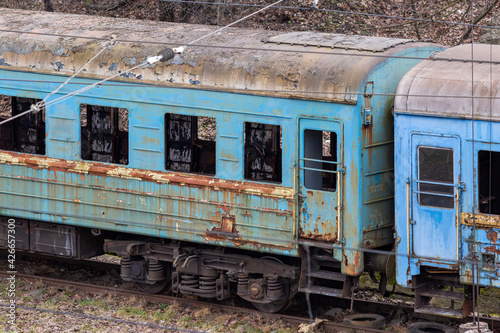 © Andriy, Obraz premium Old, rusty, abandoned train cars are at a dead end on the railway track.