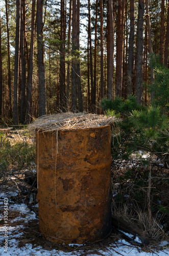 © SummerDance, Fototapeta premium Old rusty barrel in the forest with haulms