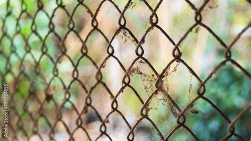 © Champ, Fototapeta premium Old rusty chain link fence in the garden. Selective focus.