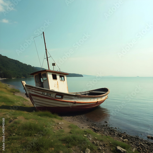 © Rehan, Fototapeta premium Old rusty fishing boat on the slope along the shore of the lake