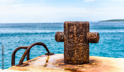© _jure, Fototapeta premium Old rusty steel mooring bollard pole on a pier.