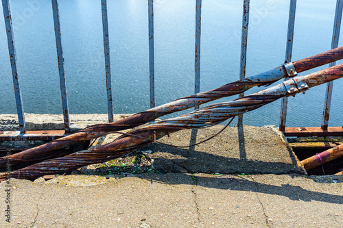 Fototapeta premium Old rusty steel rope of the bridge. Closeup