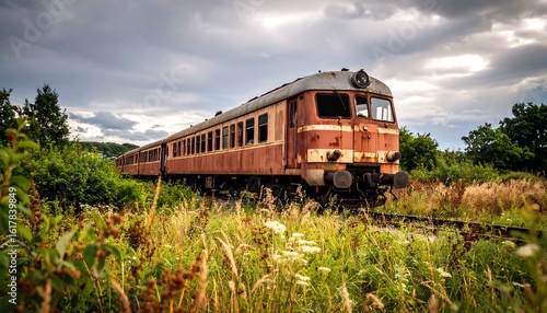 © m45jid, Obraz premium Old rusty train in overgrown field under cloudy sky