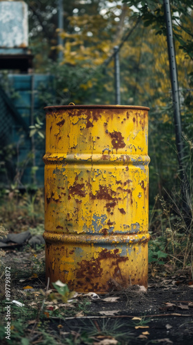 Fototapeta premium Old rusty yellow barrel in neglected industrial area