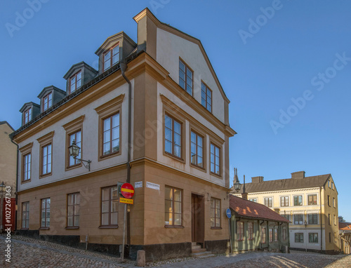 © Hans Baath, Fototapeta premium Old 1700s apartment houses with tin roofs and chimneys in the district Södermalm a winter day in Stockholm