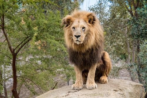 © olgavisavi, Naklejka premium old sad lion sitting on a stone