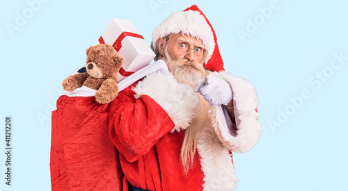 Obraz premium Old senior man with grey hair and long beard wearing santa claus costume...