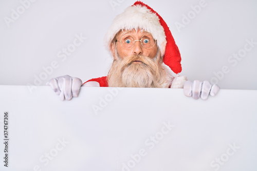 Naklejka premium Old senior man with grey hair and long beard wearing santa claus costume holding banner puffing cheeks with funny face. mouth inflated with air, catching air.