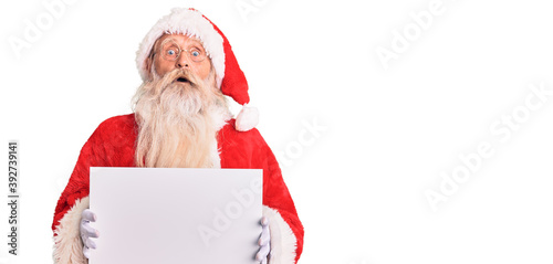 Naklejka premium Old senior man with grey hair and long beard wearing santa claus costume holding banner scared and amazed with open mouth for surprise, disbelief face