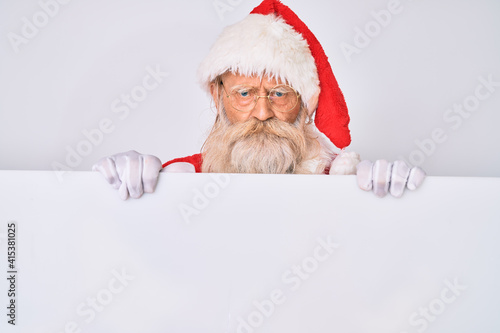 © Krakenimages.com, Naklejka premium Old senior man with grey hair and long beard wearing santa claus costume holding banner skeptic and nervous, frowning upset because of problem. negative person.