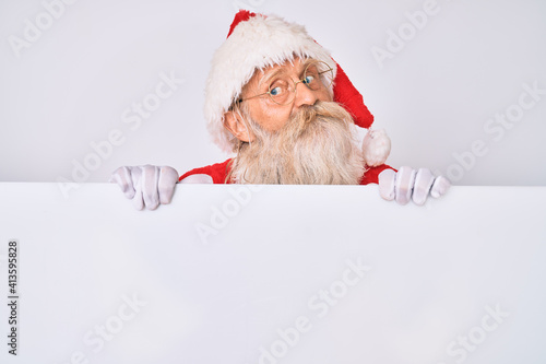 Naklejka premium Old senior man with grey hair and long beard wearing santa claus costume holding banner smiling looking to the side and staring away thinking.