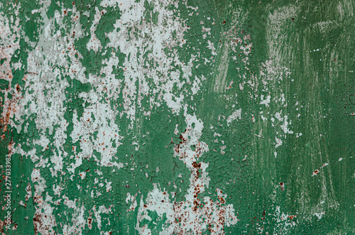 Fototapeta premium Old shabby rusty metal wall. Shabby, cracked green paint. Grunge background