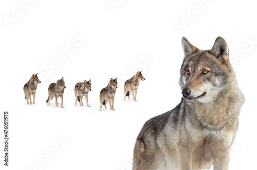 © fotomaster, Naklejka premium old she-wolf on the background of a pack of wolves