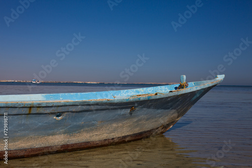 Naklejka premium Old ship rusts in shallow water. Abandoned fishing boat at sea