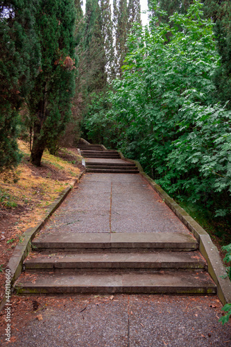 © Grigorii, Obraz premium Old sidewalk in coniferous park. Old concrete slabs.