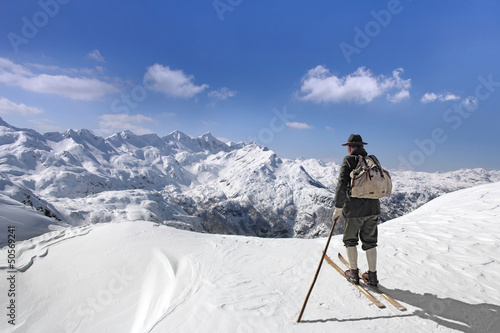 © smuki, Obraz premium Old skier with traditional old wooden skis and backpack