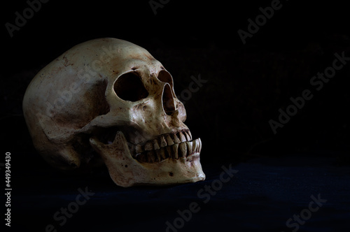 Naklejka premium Old skull put on pile of bone on dark ground and black background.
